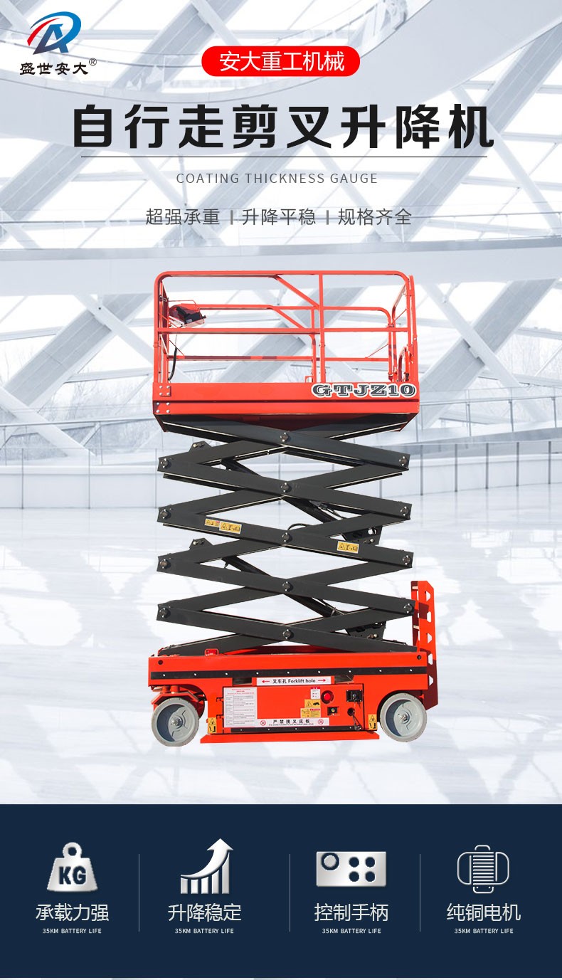 全自行式:自行式升降平臺具有自動行走功能,內置電瓶電源,操作人員只需掌握好設備前的控制手柄就能完成前進、后退、轉向、快、慢速行走和上下等動作,自行剪叉式升降平臺移動靈活,操作方便、省工、省力令高空作業更方便快捷。