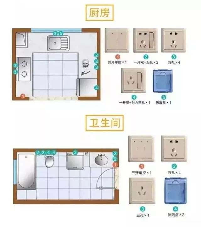 衛生間空氣潮濕,經常用水,插座要帶防濺盒。