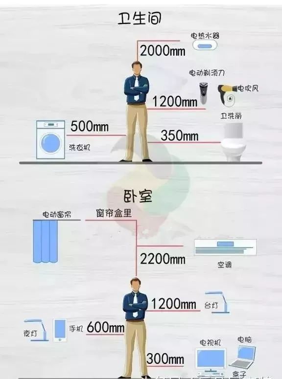如果你覺得上面的表格比較抽象的話,我們再來看一下插座布置高度圖表,這樣你該對插座安裝位置一目了然了: