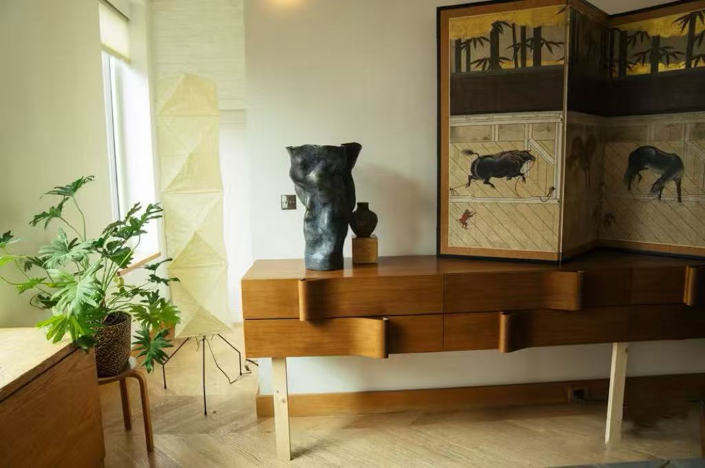 如果你覺得中古家具看多了有點(diǎn)膩,那這里的掛畫、燈具與柜體布置,絕對是點(diǎn)睛之筆。餐廚區(qū)用藝術(shù)屏風(fēng)、小型雕塑點(diǎn)綴,普通空間秒變畫廊。餐桌上的食物擺盤、咖啡杯,把日常過成電影橋段。餐廳的吊燈并未按常規(guī)高度安裝——是為了不破壞背景墻的整體感。開放式書架擺滿書籍與小物,下方設(shè)置卡座沙發(fā),將閱讀與休憩融為一體,隨手一拍就是“知識分子風(fēng)”氛圍。而整個空間中最大膽的一筆,是那一抹灰藍(lán)色——在溫潤的木色中成為“搭配神色”,客廳藍(lán)色地毯與書柜的藍(lán)色沙發(fā),沉穩(wěn)中打破沉悶,中和冷暖調(diào)。