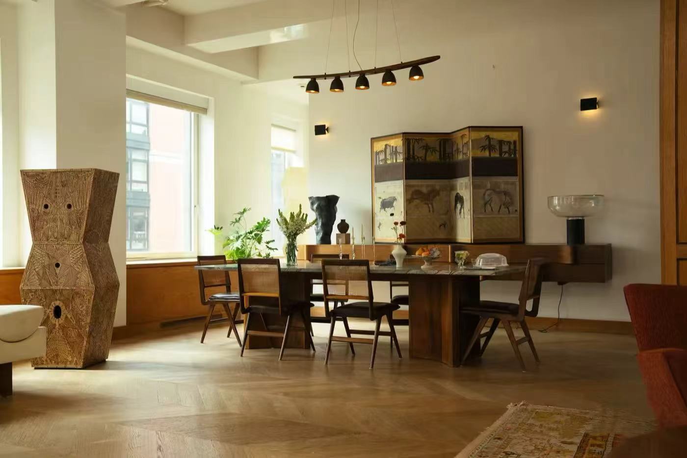 走進(jìn)這個家,仿佛步入一場靜謐的“老錢”美學(xué)盛宴。腳下是溫潤典雅的Herringbone人字拼木地板,胡桃木臺面與通頂?shù)亩ㄖ颇咀鳝h(huán)抱四周,每一處細(xì)節(jié)的收邊與質(zhì)感,都在無聲地訴說著精致。而布景師的精心點(diǎn)綴,更讓空間格調(diào)升華。這里擺放的,是Philippe Starck、Charlotte Perriand等設(shè)計大師的經(jīng)典燈具;墻上懸掛的,是Francesco Clemente、Saul Leiter等藝術(shù)家的原作。它們不是冰冷的道具,而是與空間、與人物對話的靈魂。