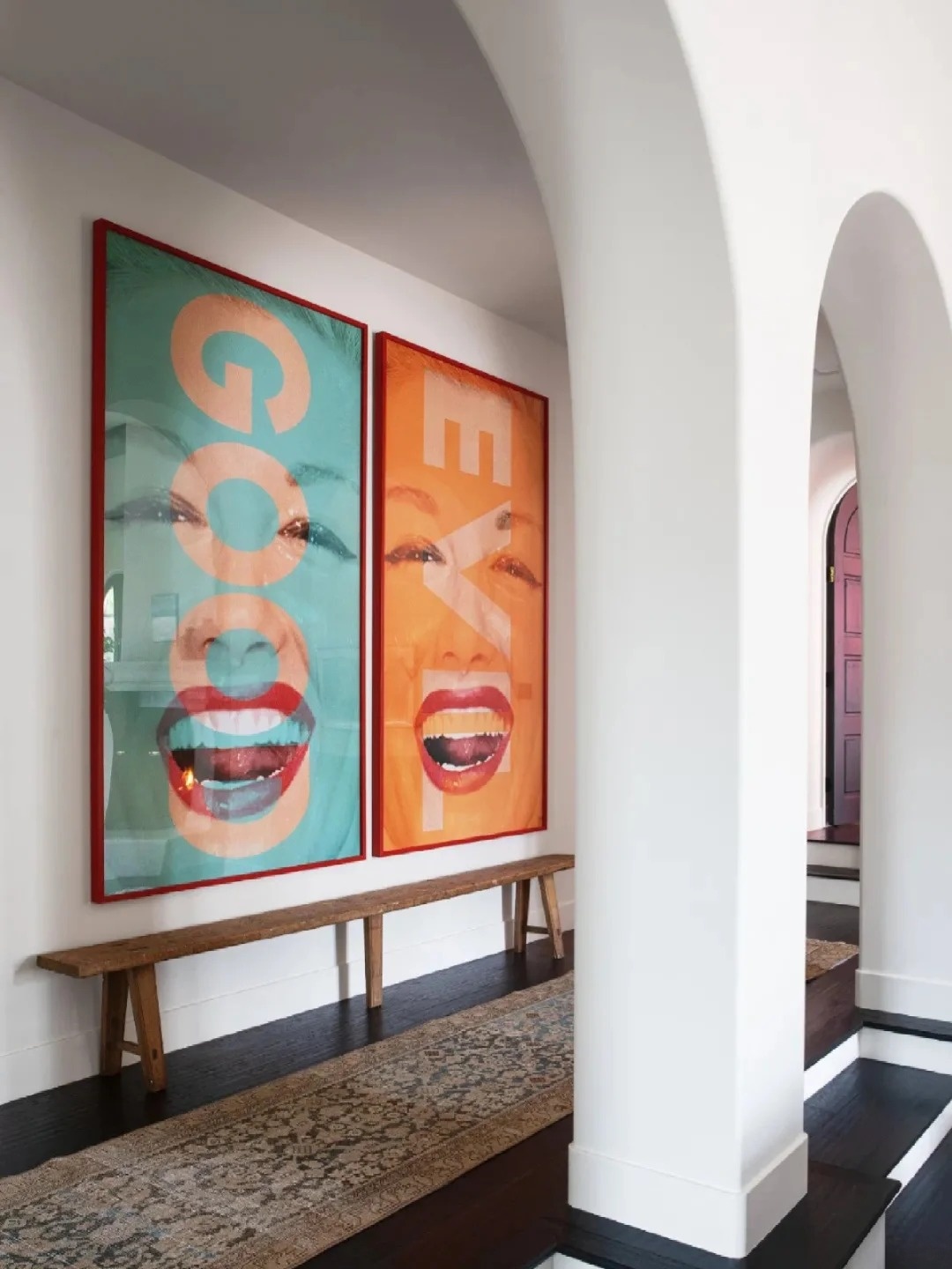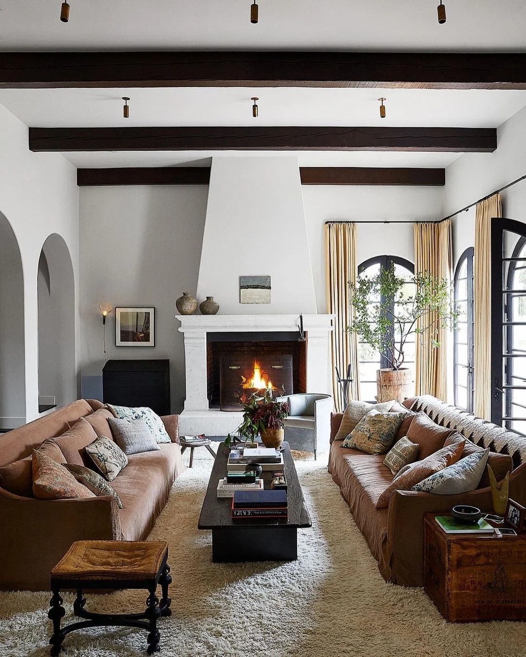 整個空間被自然光照拂,綠意點綴其間,淺色調的軟裝簡約卻不單調。Vintage家具與藝術品交織出寧靜治愈的氛圍,淺色地毯與沙發彼此呼應,客廳甚至不設電視,營造真正可沉浸的交流空間。抱枕來自Richard Shapiro、Pat McGann與Brenda Antin等設計師品牌,地毯則選自Woven,每一件單品都藏著時光的故事。
