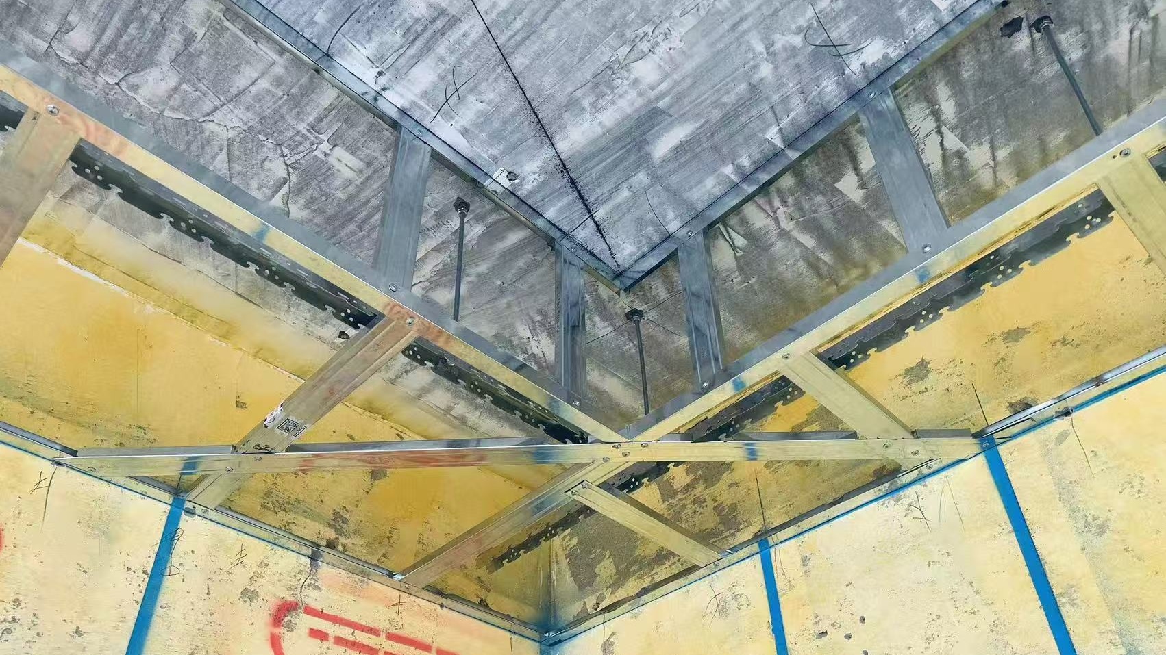 轉角處采用斜拉龍骨加強結構,主龍骨端部離墻≤100mm,靠墻側主龍骨離墻≤200mm。