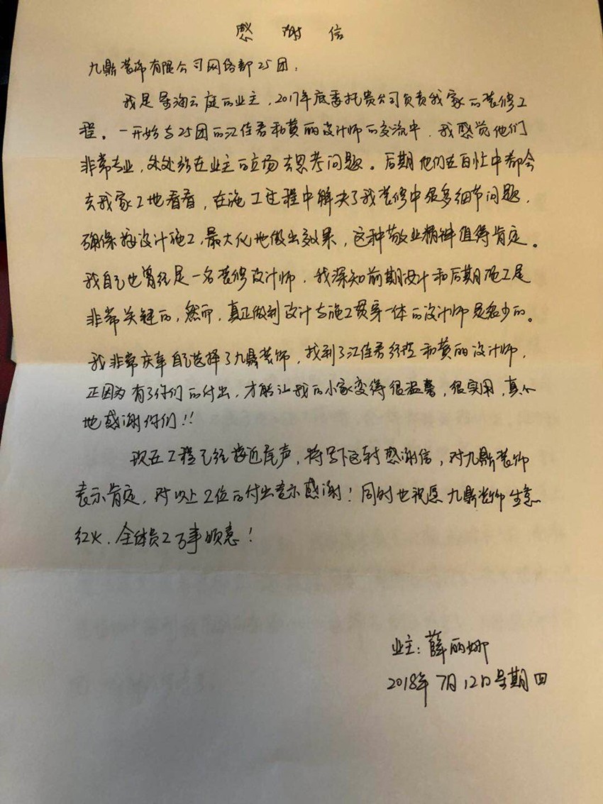 現在工程已經接近尾聲,將寫下這封感謝信,對九鼎裝飾表示肯定,對以上兩位的付出表示感謝!同時也祝愿九鼎裝飾生意紅火,全體員工萬事順意!