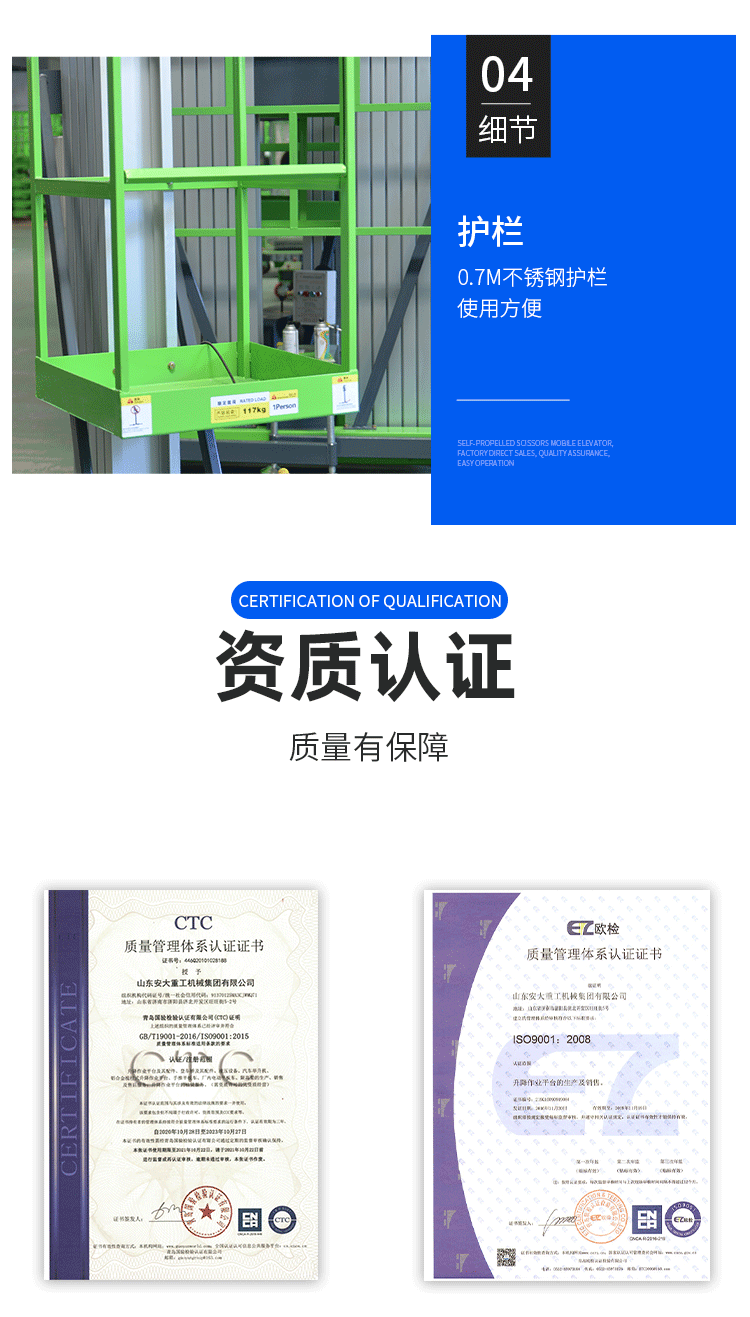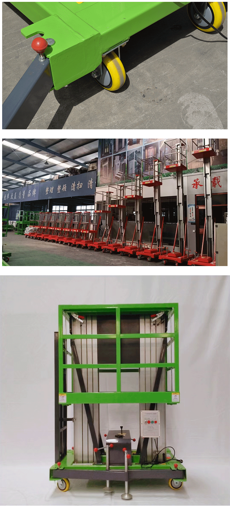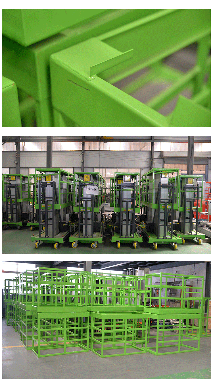 鋁合金式升降平臺采用高強度優質鋁合金材料具有造型美觀、體積小、重量輕、升降平穩、安全可靠等優點平臺自身佩帶保險鋼繩和安全保護裝置并能夠上下操作廣泛用于工廠、賓館、餐廳、車站、機場、影劇院、展覽館等場所能夠穿越一般的門廳和電梯使用極為方便。本公司新開發4+2型鋁合金升降平臺使最大工作高度達到26米。