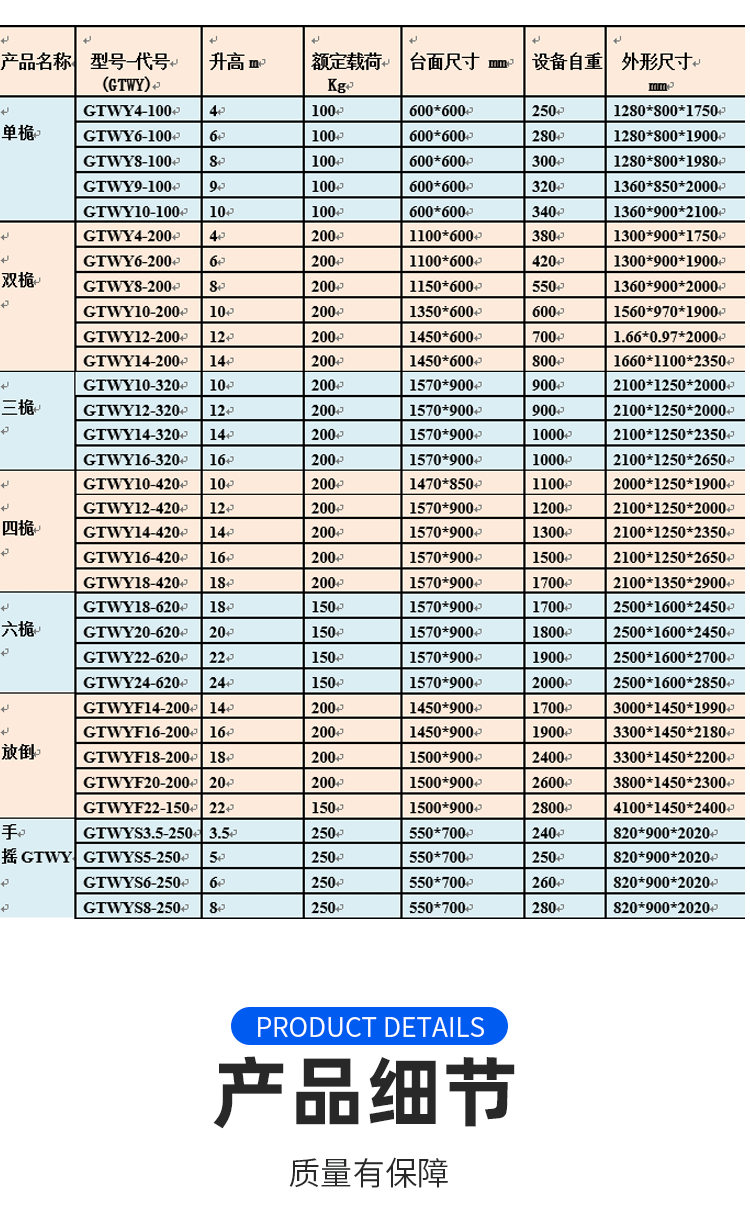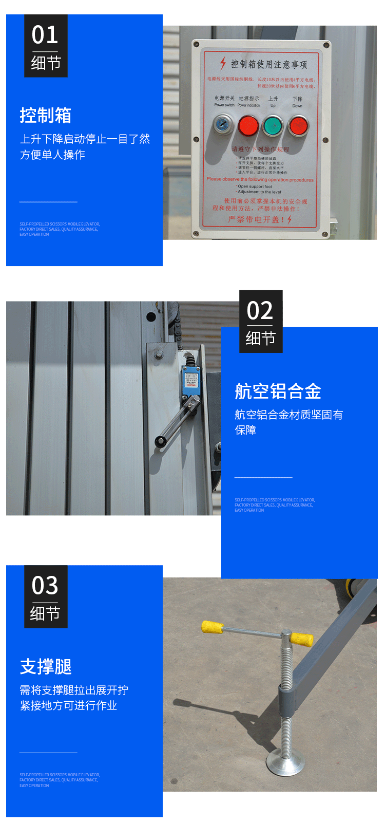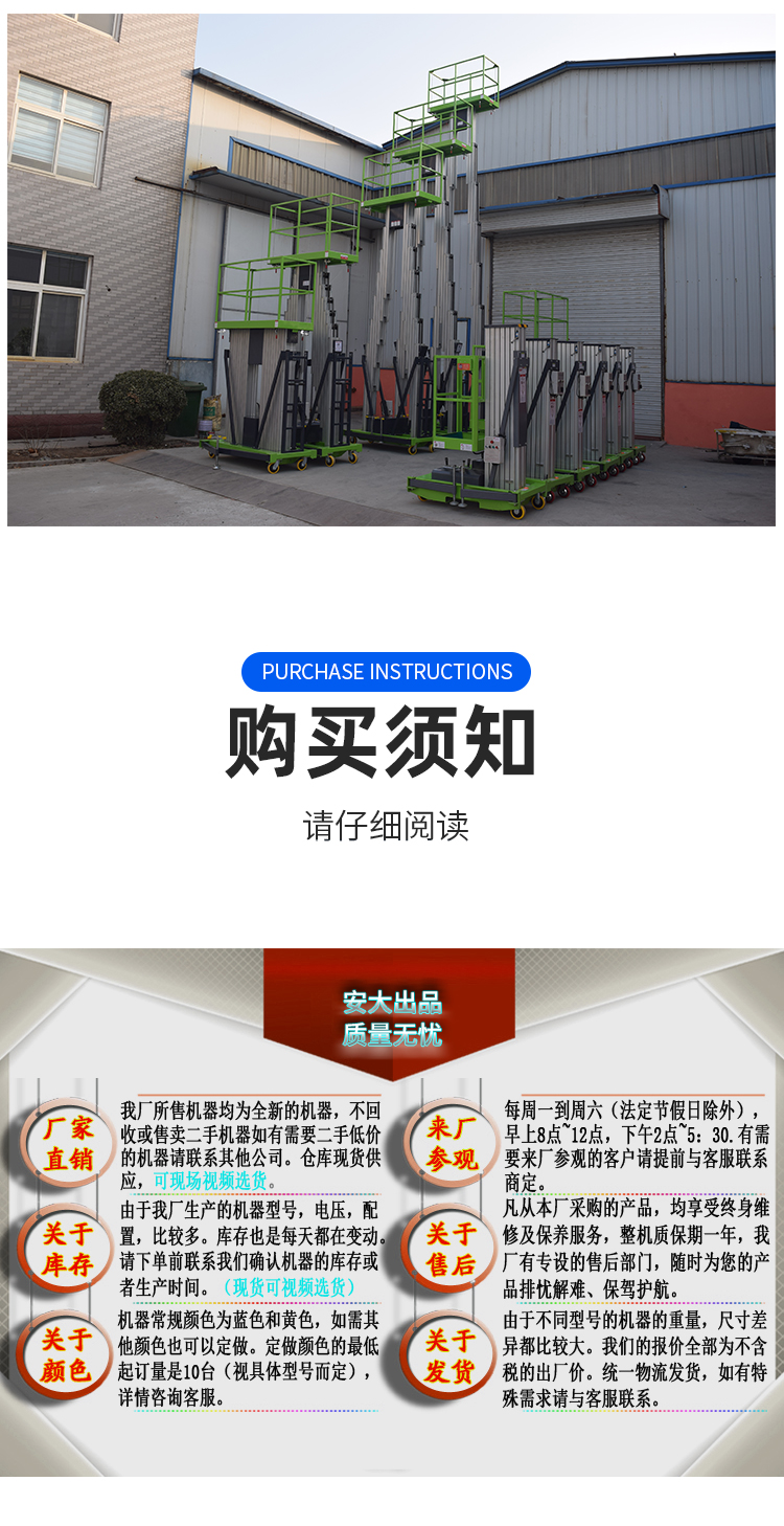 鋁合金式升降平臺采用高強度優質鋁合金材料具有造型美觀、體積小、重量輕、升降平穩、安全可靠等優點平臺自身佩帶保險鋼繩和安全保護裝置并能夠上下操作廣泛用于工廠、賓館、餐廳、車站、機場、影劇院、展覽館等場所能夠穿越一般的門廳和電梯使用極為方便。本公司新開發4+2型鋁合金升降平臺使最大工作高度達到26米。