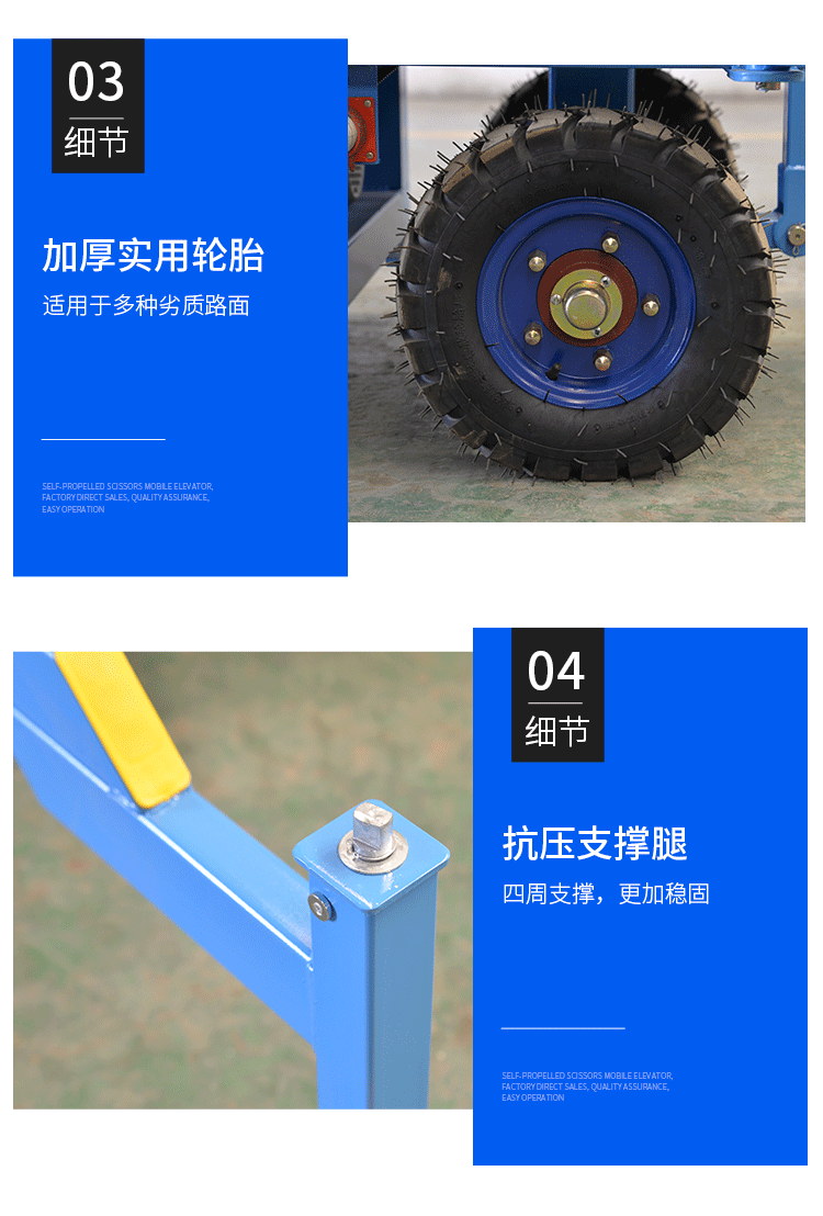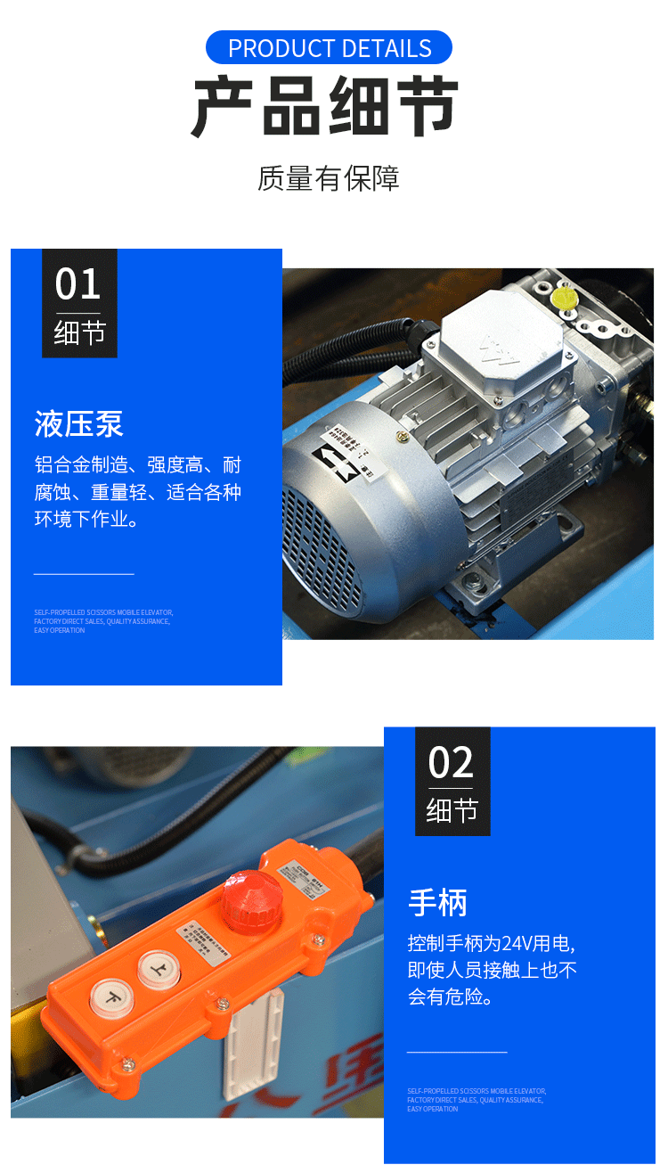 剪叉式升降平臺具有自動行走功能,整機一體式設計,內置電瓶電源,滿足在不同工作狀態下,不需 外接電源,不需外來動力牽引即可升降自如,而設備的行走轉向也只需一人便可完成。 操作人員只需掌握好設 備前的控制手柄即可完成設備前進、后退、轉向、快、慢速行走和上下等動作。自行剪叉式升降平臺移動靈 活,操作方便、省工、省力令高空作業更方便快捷,是現代企業高效安全生產之理想高空作業設備。